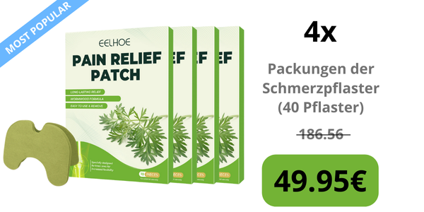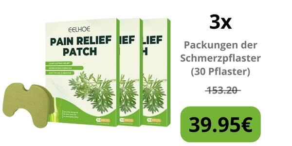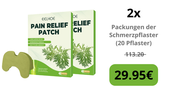 Die meisten anderen Lösungen bieten nur begrenzten Erfolg und unzuverlässige Ergebnisse, bringen eine lange Liste von Nebenwirkungen mit sich oder enthalten Substanzen, die süchtig machen können. Eelhoe liefert natürliche, effektive und sichere Inhaltsstoffe durch ein Pflaster, das direkt auf die Haut aufgetragen wird. Endlich eine nicht-invasive, sichere und einfach zu verwendende Methode zur Verbesserung der Gesundheit Ihrer Knie.